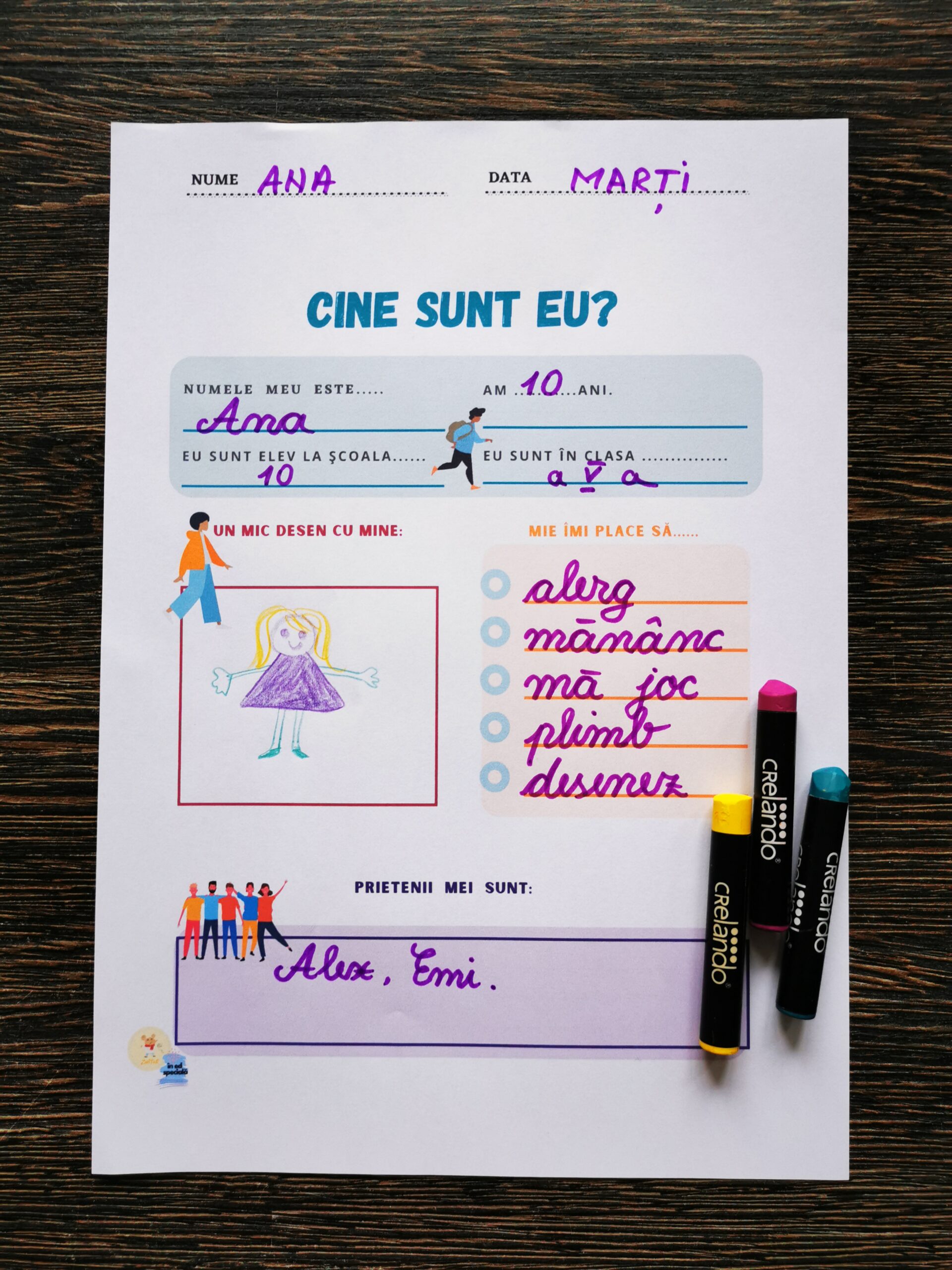 • să se gândească cum arată el: culoarea ochilor, părului, etc.